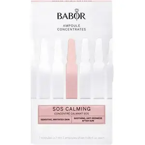 BABOR SOS Calming Ampoule Concentrates (7 x 2 ml) soothe stressed, sensitive skin and help reduce visible redness. Aloe vera intensely moisturises; cherimoya extract calms redness, itching and tightness. Finnish mushroom extract and tiger grass support regeneration and strengthen the skin barrier. Saccharides, betaine and panthenol provide extra hydration and soothing. Sterile single-use ampoules. After cleansing, shake, open with the enclosed opener or wrap a tissue and snap at the coloured ring, pour into the palm, smooth over face, neck and dcollet, pat in and follow with your moisturiser. Warnings: For external use only. If glass particles enter the product, do not use and discard immediately. | Babor Ampoules Sos Calming 7 X 2Ml In Skin.