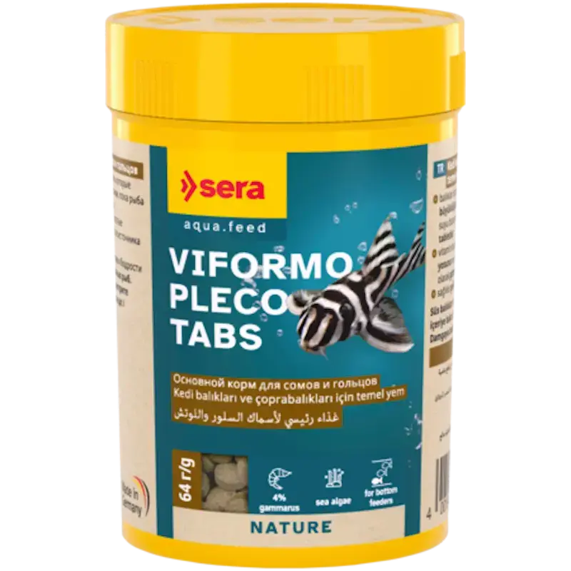 Barība samiem - Sera Viformo 100ml (64g). Viformo Pleco Tabs ir pamatbarība bez krāsvielām un konservantiem, kas sastāv no maigi ražotām tabletēm tīģerzivīm un citām apakšējās slāņa zivīm, kas meklē barību ūdens dibenā. Barojošā un viegli sagremojamā barība satur 4 % gammarus kā augstas kvalitātes olbaltumvielu un minerālvielu avotu. Gammarus ir arī bagāts ar mikroelementiem un karotinoīdiem. Sabalansētā sastāvā, kas bagātināta ar vitamīniem bagātām jūras aļģēm, tiek atbalstīta dzīvnieku veselīga attīstība un dzīvīgums. Atbilstoša barošana zivīm ar mazu muti (piemēram, koriodoriem vai sīkzivīm) ir nodrošināta, jo nogrimušās tabletes sadalās nelielos kumosos, kamēr zivis meklē barību ūdens dibenā. Barības kumosi paliek kompakti un nesaduļķo ūdeni. Sastāvs: Zivju milti, jūras aļģu milti (13%), kviešu milti, piena pulveris, alus raugs, kviešu glutēns, kukaiņu milti (Hermetia illucens), Ca-kazeināts, gammarus milti (4%), kviešu dīgsti, zivju eļļa, neapstrādāta lecītīns, veselu olu pulveris, cukurs, spirulīna, mannāna oligosaharīdi, krila milti, Haematococcus aļģes, lucerna, nātre, mencu aknu eļļa, zaļgliemežu gaļas milti, pētersīļi, paprika, spināti, burkāni, ķiploki, grieķu sierāboliņa sēklas, fenheļa sēklas, anīsa sēklas. Analītiskie rādītāji: Neapstrādāts proteīns 36,5%, neapstrādātas taukvielas 9,0%, neapstrādāta šķiedra 3,5%, mitrums 7,0%, neapstrādātie pelni 10,0%. Piedevas: 3a672a/Vit. A 22 500 SV/kg (10 200 SV/lb), 3a671/Vit. D3 1 100 SV/kg (500 SV/lb), 3a700/Vit. E 70 mg/kg (32 SV/lb), 3a820/Vit. B1 20 mg/kg (9 mg/lb), 3a825i/Vit. B2 55 mg/kg (25 mg/lb), 3a312/stabilizēts Vit. C 330 mg/kg (150 mg/lb). Ražotājs: Sera D 52518 Hainsberga, Vācija. Pilnvertīga barība samiem un uz grunts dzīvojošām zivīm. Barojoša un viegli sagremojama barība, kas satur 4 % sānpeldvēžu kā augstas kvalitātes olbaltumvielu un minerālvielu avotu; Sānpeldvēži ir bagāti arī ar mikroelementiem un karotinoīdiem; Sabalansēts sastāvs, bagātināts ar vitamīniem bagātām jūras aļģēm, atbalsta dzīvnieku veselīgu attīstību un dzīvīgumu. Sastāvs: Zivju milti, jūras aļģes, piena pulveris, kviešu milti, alus raugs, kviešu lipeklis, sānpeldvēži 4 %, Ca-kazeināts, cukurs, kviešu dīgļi, dzelkņmušas, spirulīna, zivju eļļa, mannanoligosaharīdi, krils, mencu aknu eļļa (kas satur 34 % omega taukskābju), Haematococcus aļģes, garšaugi, lucerna, nātre, zaļās gliemenes, pētersīļi, paprika, ķiploki, spināti, burkāni. Analītiskais sastāvs: Kopproteīns min. 35,3 %, koptauki min. 7,0 %, kopšķiedra maks. 7,0 %, mitrums maks. 7,5 %, koppelni maks. 10,8 %. Ražotājs: Sera, Vācija