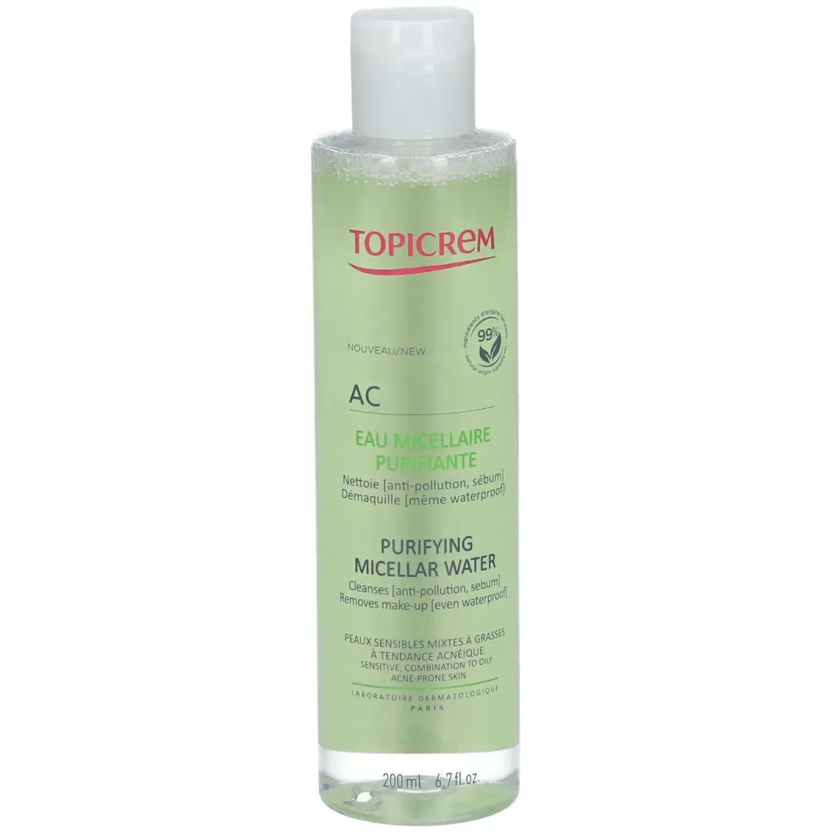Topicrem ACPurifying Micellar Water cleanses and removes make-up from combination, oily and acne-prone skin. This micellar water contains micelles of natural origin which offer high cleansing and make-up removing efficacy: it eliminates impurities, waterproof make-up and pollution particles. Its delicate formula is suitable for sensitive skin and helps reduce excess sebum without drying the skin. Result? The skin breathes, it no longer shines. For chi? Adolescents, adults Combination and oily acne-prone skin Texture Fresh water Addictive tonic scent with notes of white iris, lily of the valley and vanilla.