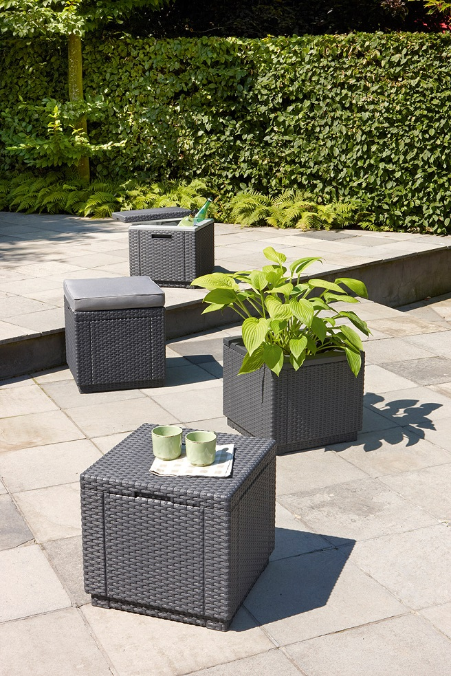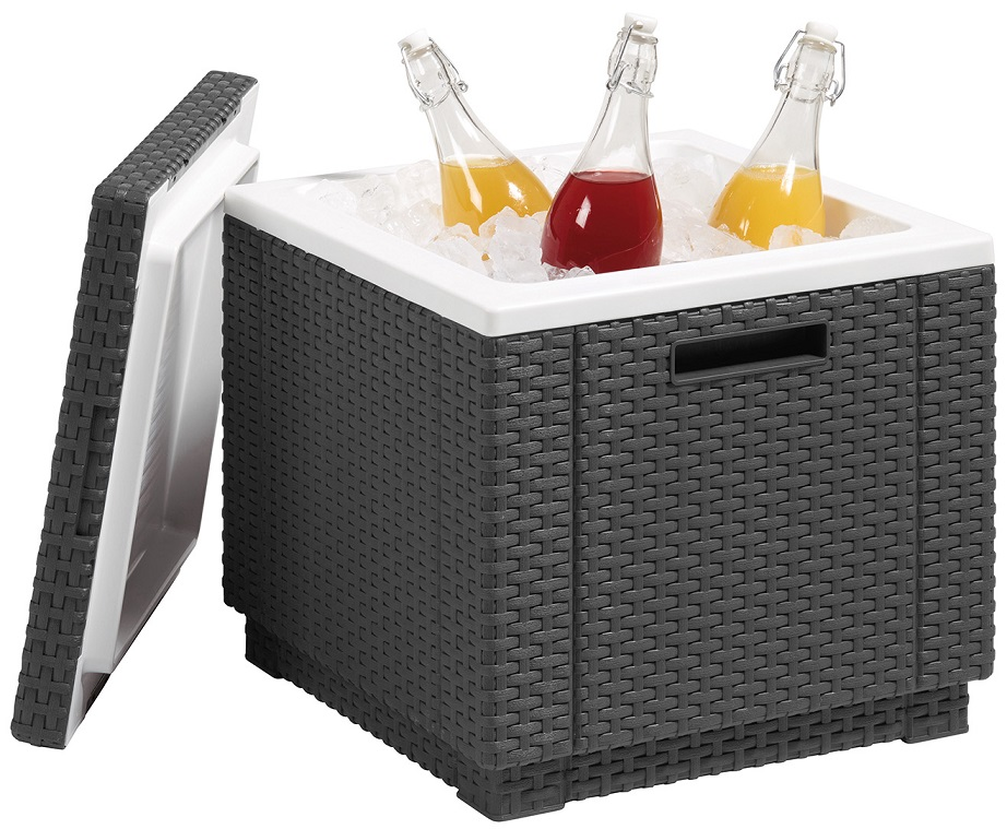 Praktiškas ir originalus sprendimas – tai galima pasakyti apie šį Allibert gėrimų šaldytuvą Ice Cube 213828. Šį šaldytuvą galėsite naudoti ir kaip žurnalinį staliuką ar kėdutę kojoms. Gražus pintas dizainas puikiai derės prie įvairių lauko baldo komplektų. Patogios rankenėles padės lengvai pernešti šaldytuvą. Iškyla parke? Diena paplūdimyje? Vakarėlis terasoje ar balkone? Viskas išliks vėsiu ir skaniu šiame patogiame Ice Cube šaldytuve. Ice Cube gali būti naudojamas ir kaip papildoma sėdima vieta. Spalva: grafito Matmenys: 42 x 42 x 41 cm (ilgis x plotis x aukštis) Talpa: 40 l Medžiaga: plastikas (pinto baldo imitacija) Atsparus oro sąlygoms Patogus nešti