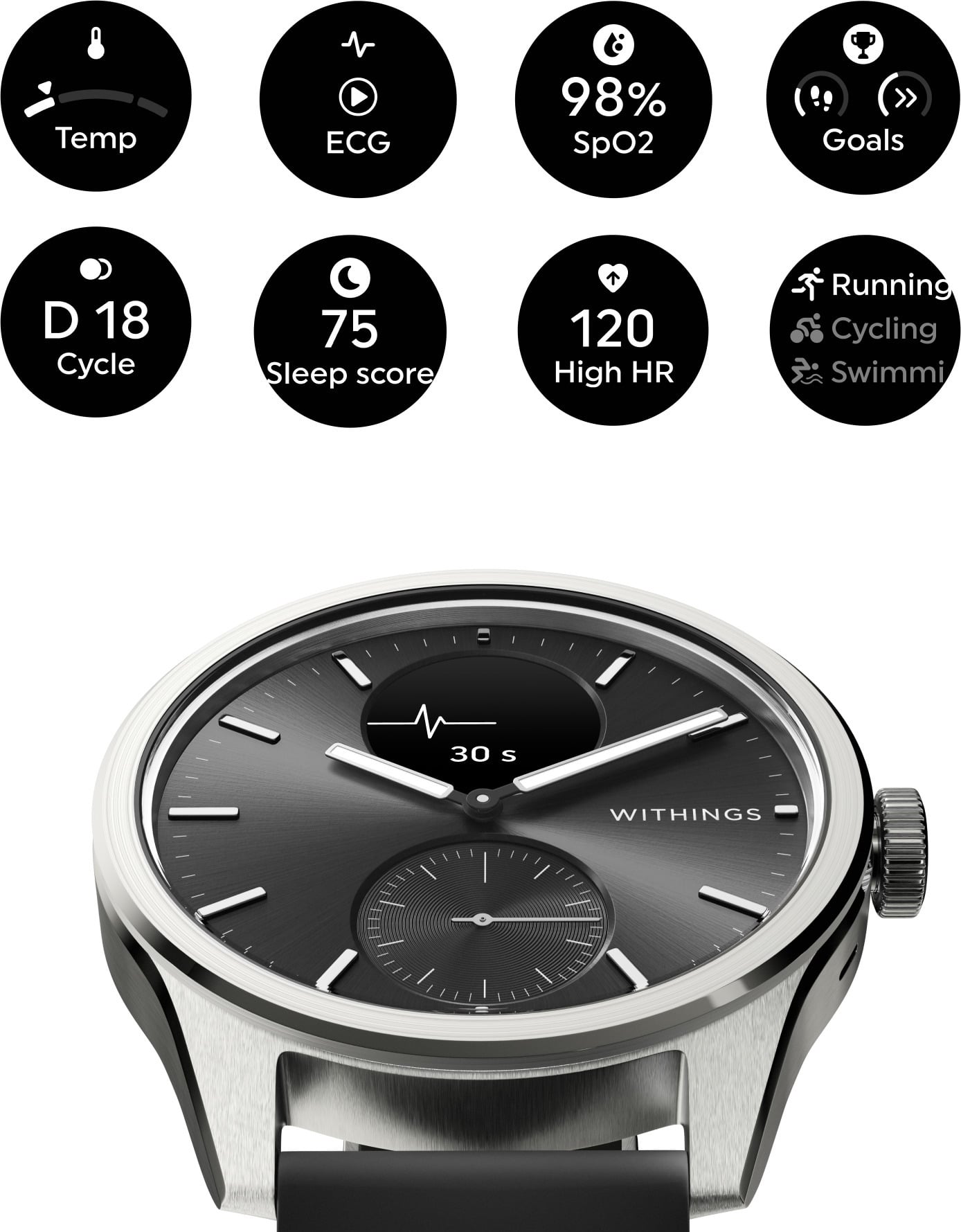 ScanWatch 2 on enemmän kuin pelkkä hybridiälykello – se valvoo terveyttäsi väsymättä. Uusi sukupolvi sisältää uusia ja eksklusiivisia antureita, mukaan lukien TempTech24/7-moduulin, joka tarjoaa ensimmäistä kertaa kehon lämpötilan vaihtelun seurannan yöllä ja päivällä sekä ennakoivia sydämen terveyttä koskevia ilmoituksia, eteisvärinän tunnistuksen 1-johtimisen EKG:n kautta ja veren happipitoisuuden mittauksen. Yhdessä nämä anturit voivat auttaa jokaista ylläpitämään terveellistä elämäntapaa vaivattomasti. ScanWatch 2:ssa on myös tunnusomainen unen ja aktiivisuuden seuranta sekä poikkeuksellinen 30 päivän akunkesto yhdellä latauksella.