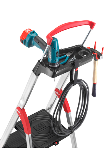 Buitinės kopėčios HAILO L100 TopLine - 5 pakopos HAILO aliuminio kopėčias užfiksuokite apsauginiu laikikliu, platformos užraktu ir universaliu dėklu - lentyna. Šiuo kopėčios turi yra itin gilias ir stabilias 130 mm gylio XXL formato pakopas Papildoma informacija. * Kopėčios gali būti komplektuojamos su HAILO Easy Clix antgaliais (papildomas priedas) * Platformos užraktas - saugiam užrakinimui ir atrakinimui * Juodos XXL dydžio pakopos su neslystančiomis briaunomis ir ypač giliu pagrindu. * Cinkuoto plieno platforma iš juodo plieno su neslystančiomis standžiomis briaunomis. * Ištraukiamas apsauginis laikiklis, skirtas laikytis ant kopėčių. * Universalus laikymo dėklas - lentyna, ant kurio jūs galite padėti įrankius, smulkius daiktus ar dažų indelius, kol esate ant kopėčių. * Greita ir lengva kilpa, skirta pritvirtinti kabelius, laidus ar kitus lanksčius daiktus. * 1 universalus kabliukas žirklėms, valymo reikmenims, dažymo volelių priedams. * 1 laikiklis T formos daiktams, pvz., plaktukui, įpjovai ir pan. patalpinti. Kiti produkto privalumai: * Patikimas aukštųjų technologijų kniedytas pakopų sujungimas. * Neslystantis kopėčių pagrindas * Kopėčios skirtos svoriams iki 150 kg. Gaminio specifikacija: * 5 pakopos * Darbinis aukštis - maks. 307 cm * Svoris - 6,3 kg