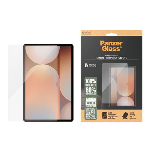 The PanzerGlass® screen protector. Tested by kids. Approved by parents.PanzerGlass ® Screen Protector Samsung Galaxy Tab S10 FE | S9 5G | S9 FE 5G | Ultra-Wide Fit. Brand compatibility: Samsung, Compatibility: Samsung - Galaxy Tab S9 FE 5G, Samsung - Galaxy Tab S9 5G, Samsung - Galaxy Tab S10 FE. Dry application. Protection features: Scratch resistant, Shock resistant. Material: Tempered glass, Polyethylene terephthalate (PET), Silicone, Product colour: Transparent. Quantity per pack: 1 pc(s)