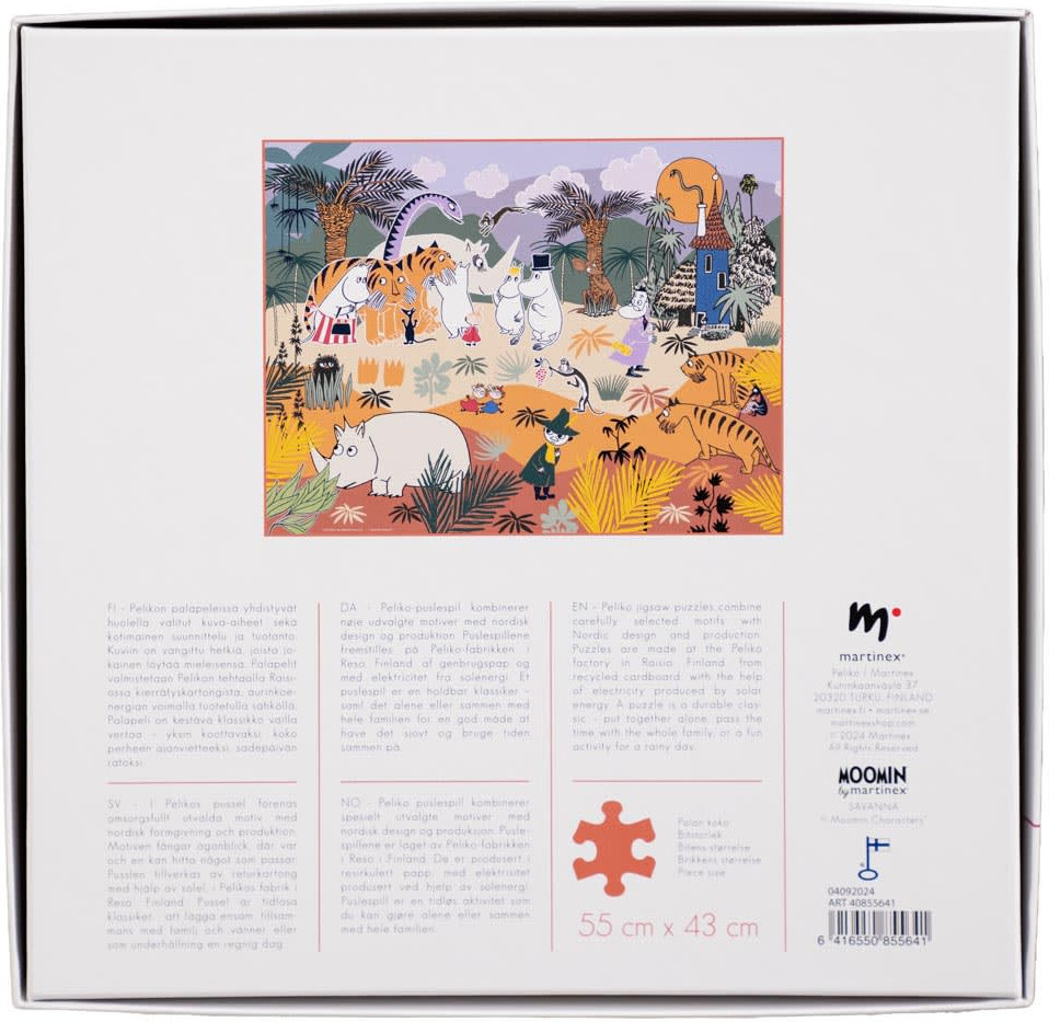 In the colourful and detailed picture in the Savannah Puzzle, the people of Moomin Valley encounter animals such as tigers, rhinos and snakes in the dense jungle that has grown up around the Moomin House. The 750-piece puzzle measures 55 x 43 cm, providing plenty of challenge and fun for puzzle lovers and Moomin fans alike. The puzzle is made in Finland from recycled cardboard.