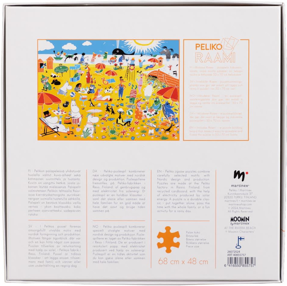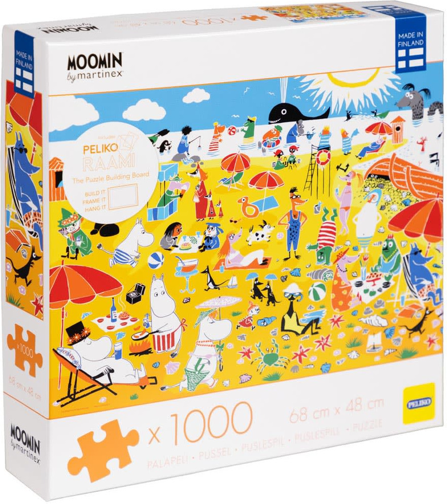 If you love Moomins, this 1000 piece puzzle is the perfect choice for you. The colourful illustration shows the Moomin family and friends enjoying a sunny day on the French Riviera beach. Each piece brings out details of the hustle and bustle of the beach, and the colours in the picture make assembling a fun and rewarding experience. The puzzle is ideal for beginners and more experienced puzzle enthusiasts alike. Made in Finland from recycled cardboard, the puzzle measures 68 x 48 cm when assembled.
