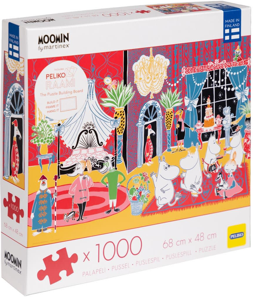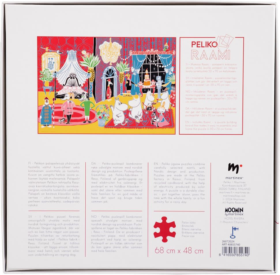 The puzzle comes with a Peliko Frame assembly tray for easy assembly and to keep the pieces in place. It also makes it easy to frame the finished puzzle, which fits into a 50 x 70 cm frame. The high quality Hotel Riviera puzzle is a great gift for Moomin fans or puzzle lovers.