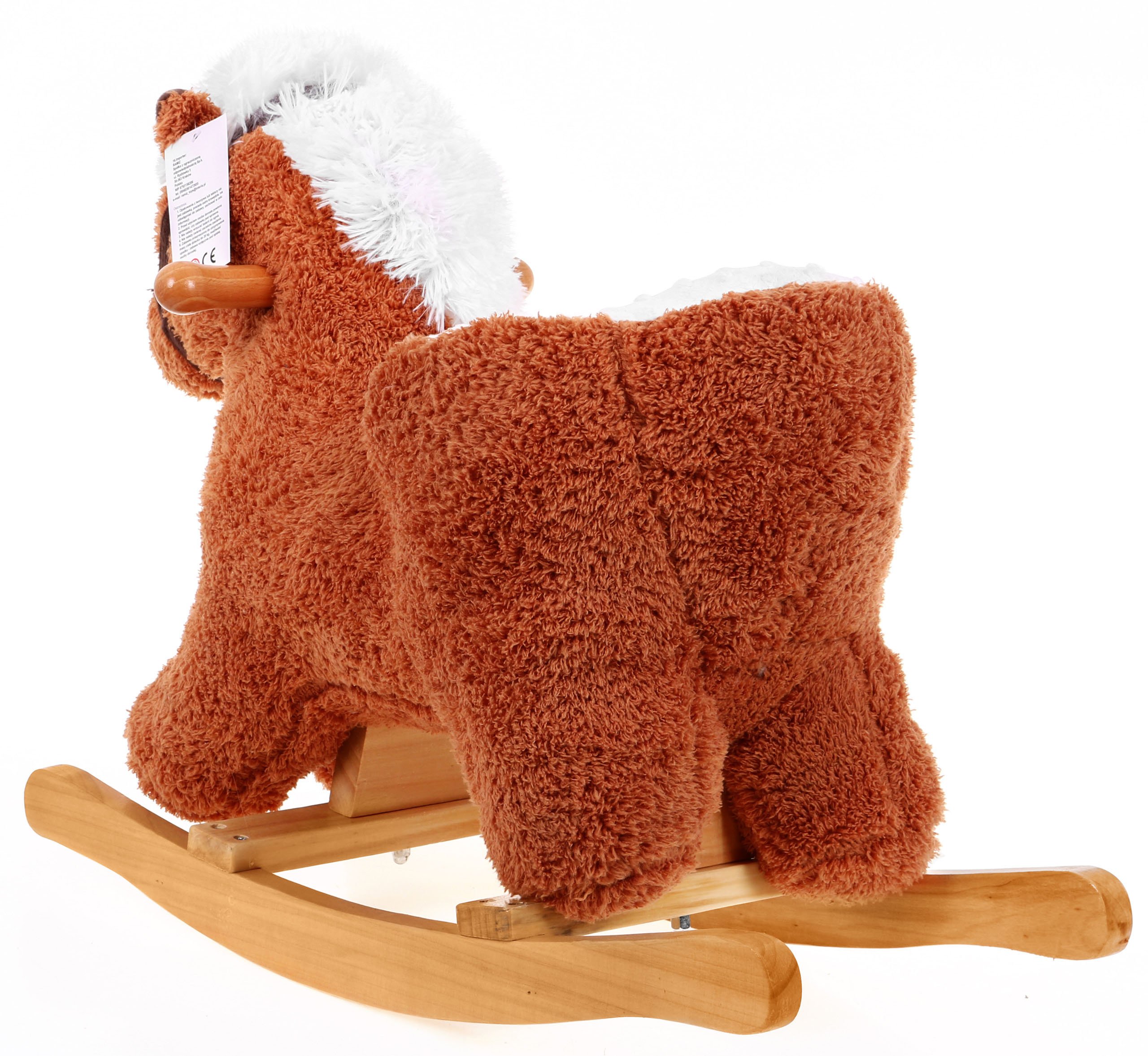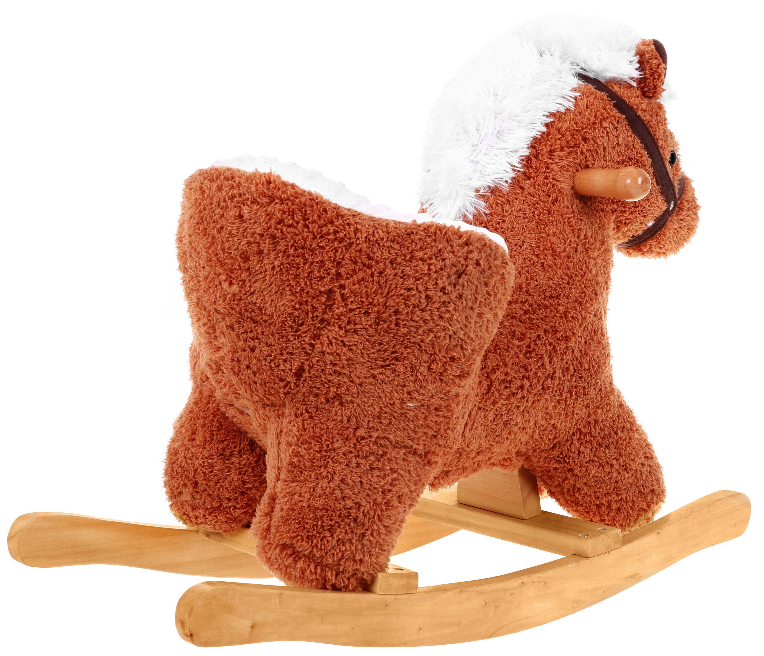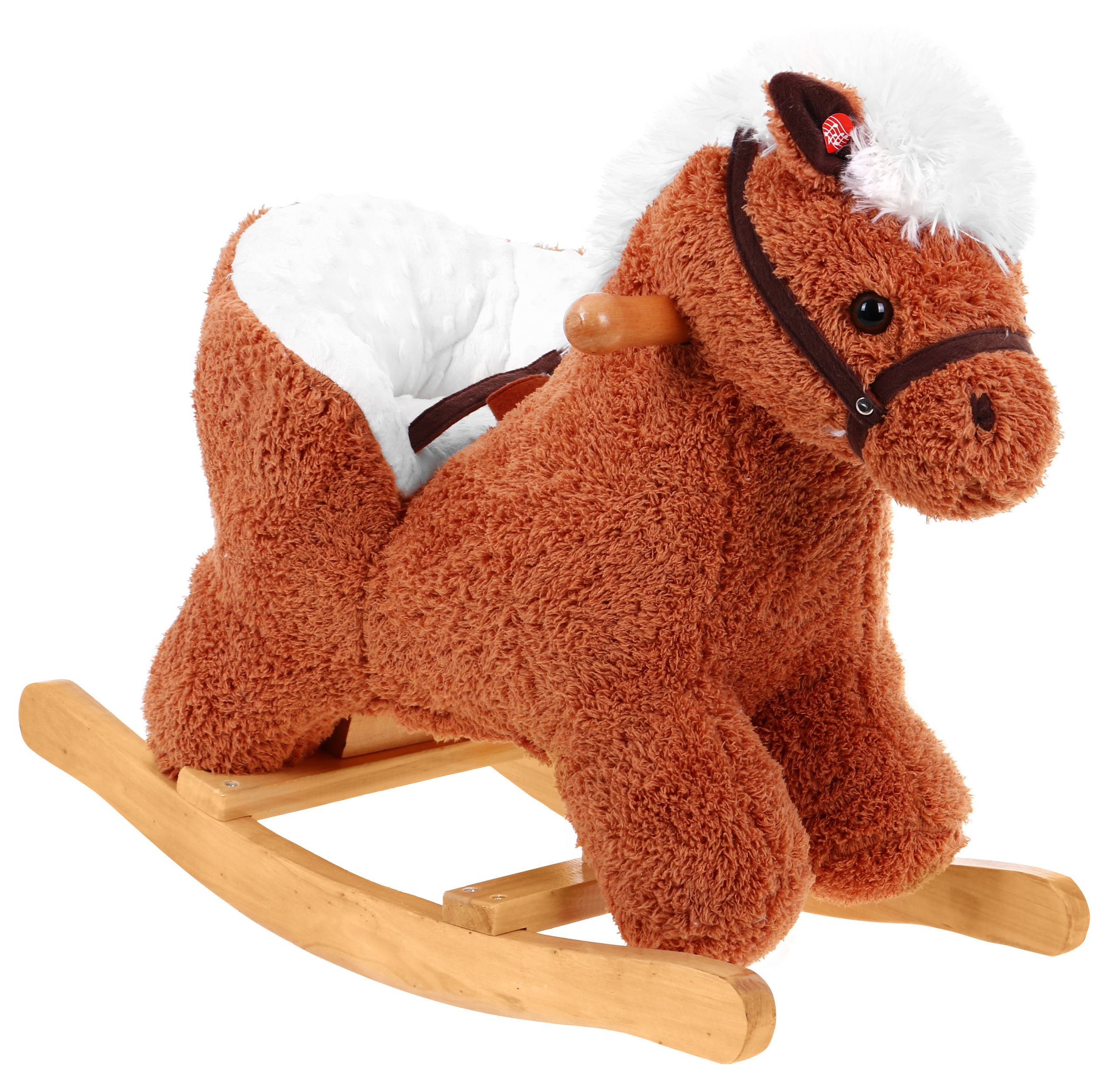 The toy was made of very soft plush, very nice to the touch.An additional advantage is comfortable support and straps that allow for safe play.In the right ear of the tailstock there is a sensor, which when pressed triggers the sounds of a galloping horse and neigh, these sounds make the game more exciting.The intensity of sounds has been properly adapted to listening by the youngest children.Presented little horse for children is a great gift for the most demanding child, will bring a lot of joy and provide an unforgettable experience.His amazing, beautiful eyes encourage everyone to play.The horse additionally has wooden handles allowing for safe play.The toy is intended for children over 1 year and has a CE certificate. Size - height 46 cm,- length 55 cm,- width 24 cm,- saddle 28 cm. Power 3 x AA 1,5V battery (not include).