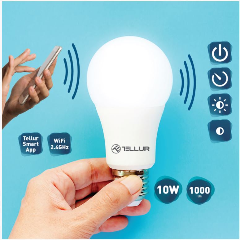 Easy to install and use with TELLUR SMART App Timer, schedule, integrated functions, fully customizable No master HUB or subscription required Up to 150 registred devices at the same time Voltage 220-240V Power consumption 10W Lumens +/-10% 1000lm Beam Angle 270° Socket E27 Colour temperature 2700K-6500K Lifetime 25000h Wireless frequency 2.4GHz WiFi standard IEEE 802.11b/g/n Security WPA-PSK/ WPA2-PSK /WPA/WPA2/WEP/WPS2/WAPI Encryption type WEP/TKIP/AES Standby consumption ≤0.3W CRI Ra>80 Working condition temperature -5~45° Working condition humidity ≤80% Compatibility : Devices with Android 4.1 / iOS 8 or higher Product weight 90 g Product dimensions 13,1 x 6,7 x 6,7 cm Gross weight 122 g Packaging dimensions 13,7 x 7,2 x 7,2 cm