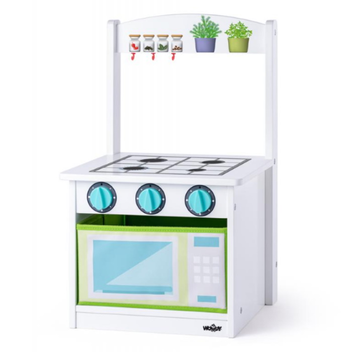 Woody 90259 - Eko koka Rotaļu krāsaina virtuve un bērnu krēsls, uz kura var pasēdēt. Izgatavots no īpaši kvalitatīva un ekoloģiska koka materiāla un bērnam nekaitīgām un sertificētam krāsvielām. Rotaļlieta dos iespēju pavadīt aizraujoši un interesanti laiku, kā spēlējoties vienam pašam, gan arīs pēlējoties kopā ar draugiem. Komplektā ir rotaļu virtuve. Dota rotaļlieta piemērota gan meitenēm, gan zēniem.