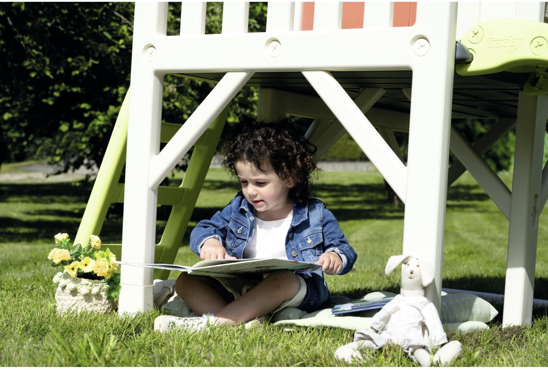 Smoby Life House on Stilts is full of play opportunities. The pedestrian playhouse has a small porch, stairs and a slide. The half door of the house is handy and provides light. More light floods into the cottage from the windows, two of which have louvres and sliding shutters/shades.