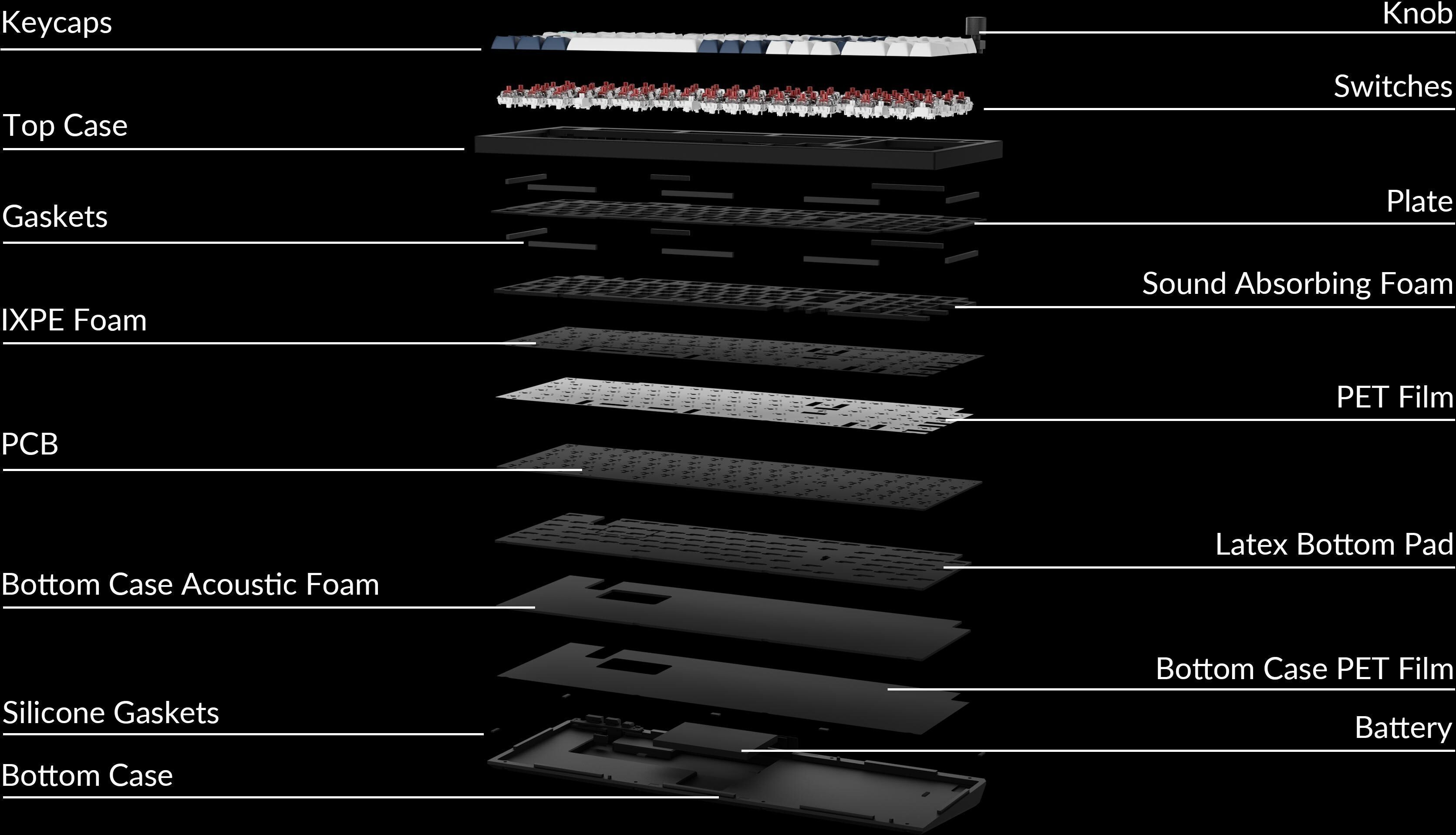 Double-Gasket Construction In addition to the plate gaskets, the keyboard features silicone pads between the top and bottom, which significantly reduce metal-to-metal acoustic resonance and metal-to-metal sound. Experience next-level keystrokes and comfort with a gasket-mounted, flexible PC (polycarbonate) plate. This design combination preserves the flexibility of the keyboard's compact structure and significantly improves typing sound.