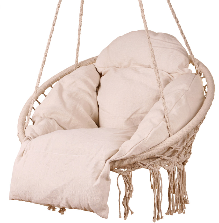 Karājošais krēsls ar XXL spilvenu garantē komfortu jūsu dārzā. Izturīgie auklas spēj izturēt līdz 120 kilogramiem. Spilvens ar mīkstu pildījumu nodrošina komfortu šūpojoties. Pelēkā krāsa lieliski iederēsies dārza zaļumā vai mājas interjerā. Montāžas detaļas nav iekļautas komplektā. Tehniskās specifikācijas: Maksimālais svars: 120 kg Krāsa: pelēka Materiāls: kokvilnas auklas, metāla rāmis, spilvens izgatavots no kokvilnas un poliestera Kopējais diametrs (platums ar atzveltni): 80 cm Garākās auklas garums: 100 cm Īsākās auklas garums: 88 cm Ziedu pušķa garums: 18 cm Atzveltnes augstums: 41 cm Sēdekļa diametrs: 62 cm Spilvena izmēri (garums x platums x atzveltnes augstums): 64 cm x 56 cm x 53 cm Iepakojuma izmērs: 82 cm x 82 cm x 8,5 cm Komplektā ietilpst: Karājošais krēsls Spilvens