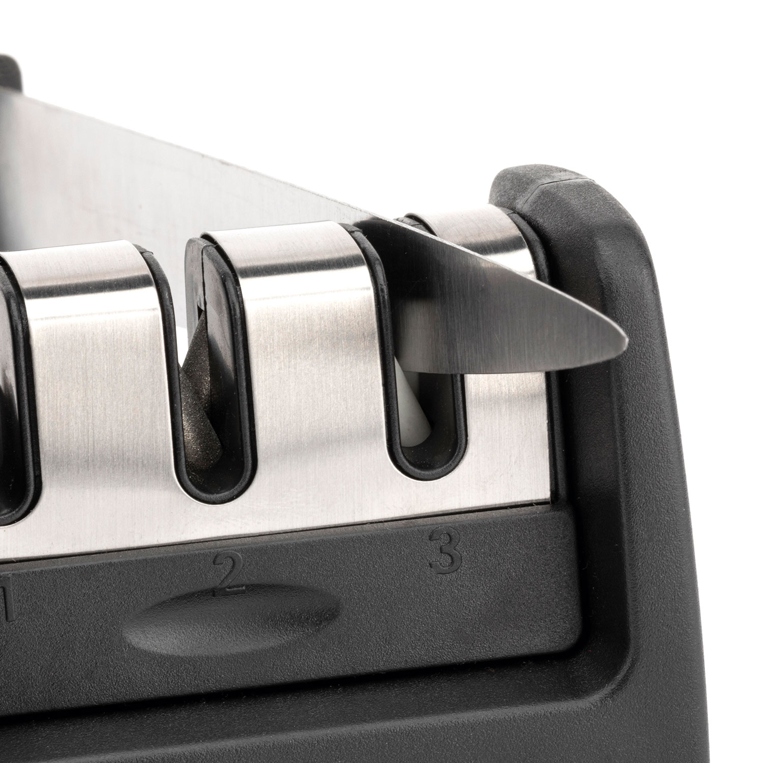 Точилка для ножей с нескользящим основанием и ручкой для поддержания остроты ножей и идеальной гладкости срезов.