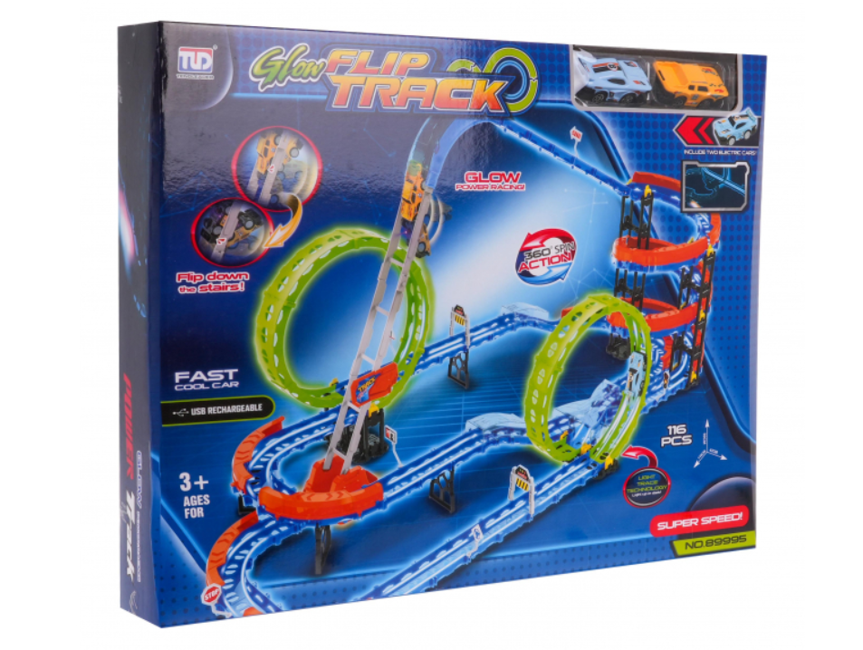 Большой многоуровневый гоночный трек с лестницей, крутыми поворотами, петлями и машинками подходит для детей от 3 лет. Набор состоит из 116 элементов для самостоятельной сборки и включает в себя прямые участки, крутые повороты с барьерами, предотвращающими сход автомобиля с трассы, две петли на 360 градусов и лестницу. Петли также флуоресцентные и светятся в темноте. Машины, входящие в набор, очень быстрые и подсвечиваются снизу. Они работают от батарейки 3,7 В, аккумулятор находится в машинах. |