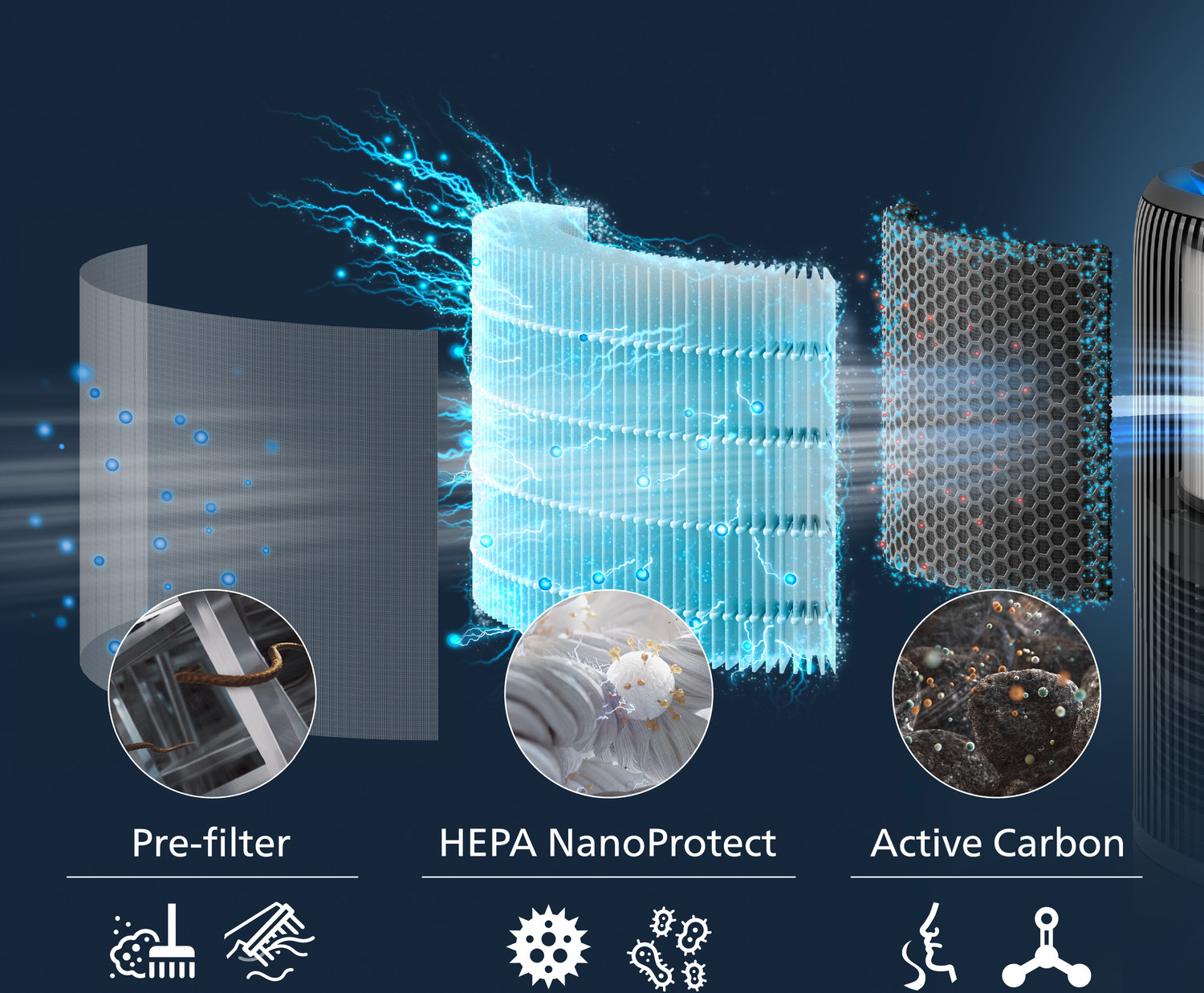 The inlet filter, HEPA NanoProtect and activated carbon filter pick up particles as small as 0.003 microns - smaller than known viruses.