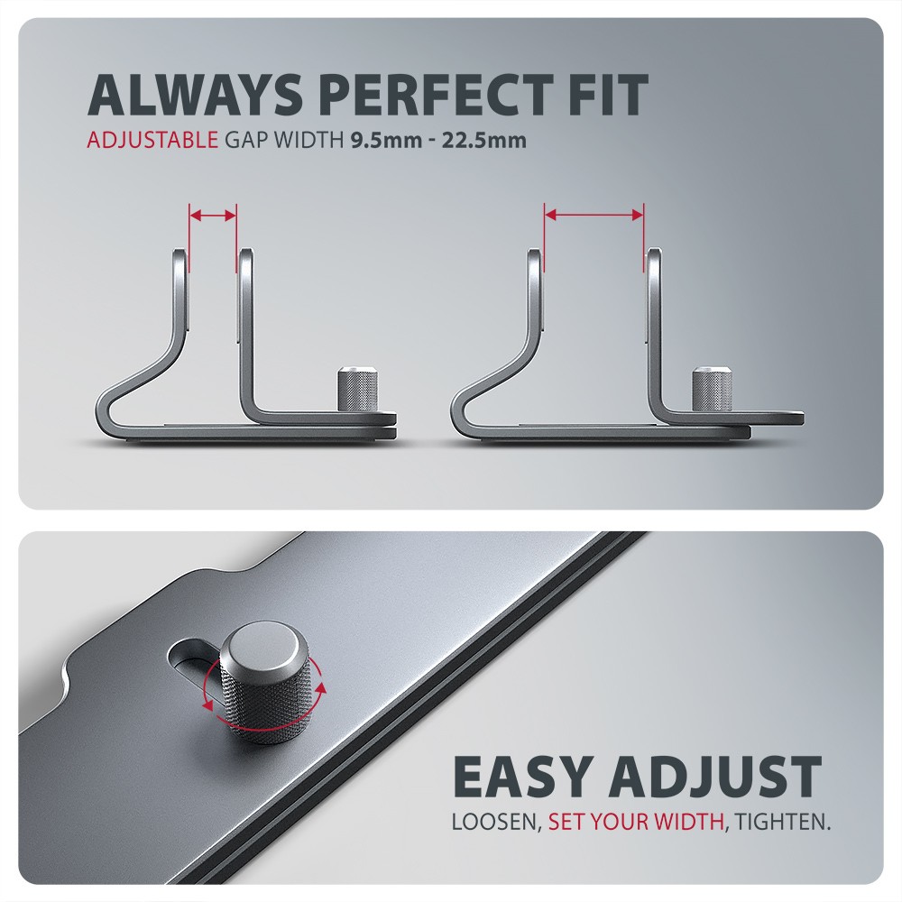 Специальные функции Aluminiowa podstawka do pionowego umieszczania laptopów o przekątnej 1017.3". Regulowana szerokość szczeliny 9.525.5 mm