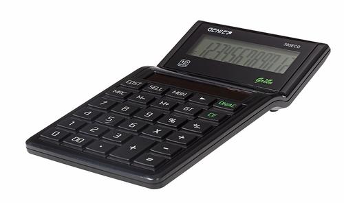Функции: Основные расчеты [+] [-] [x] [/], Проценты [%], Кнопка смены знака [+/-], 3-кнопочная память [M +] [M-] [MRC], Двойное нажатие [ 00], Кнопка исправления [>], Расчет наценки [COST] [SELL] [Margin], Сложение общего [GT], Удаление: Последний ввод [CE]Genie 305 ECO. Форм-фактор: Настольный, Тип: Базовый. Цифр: 10 цифр, Количество строк на дисплее: 1 строка. Источник питания: Солнечный. Цвет продукта: Черный